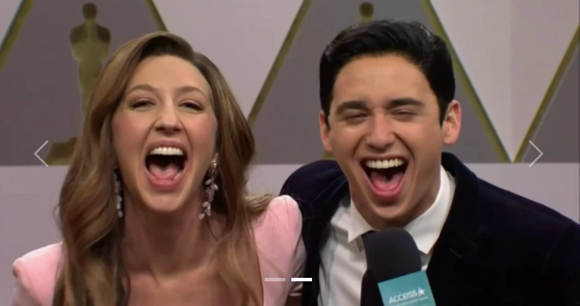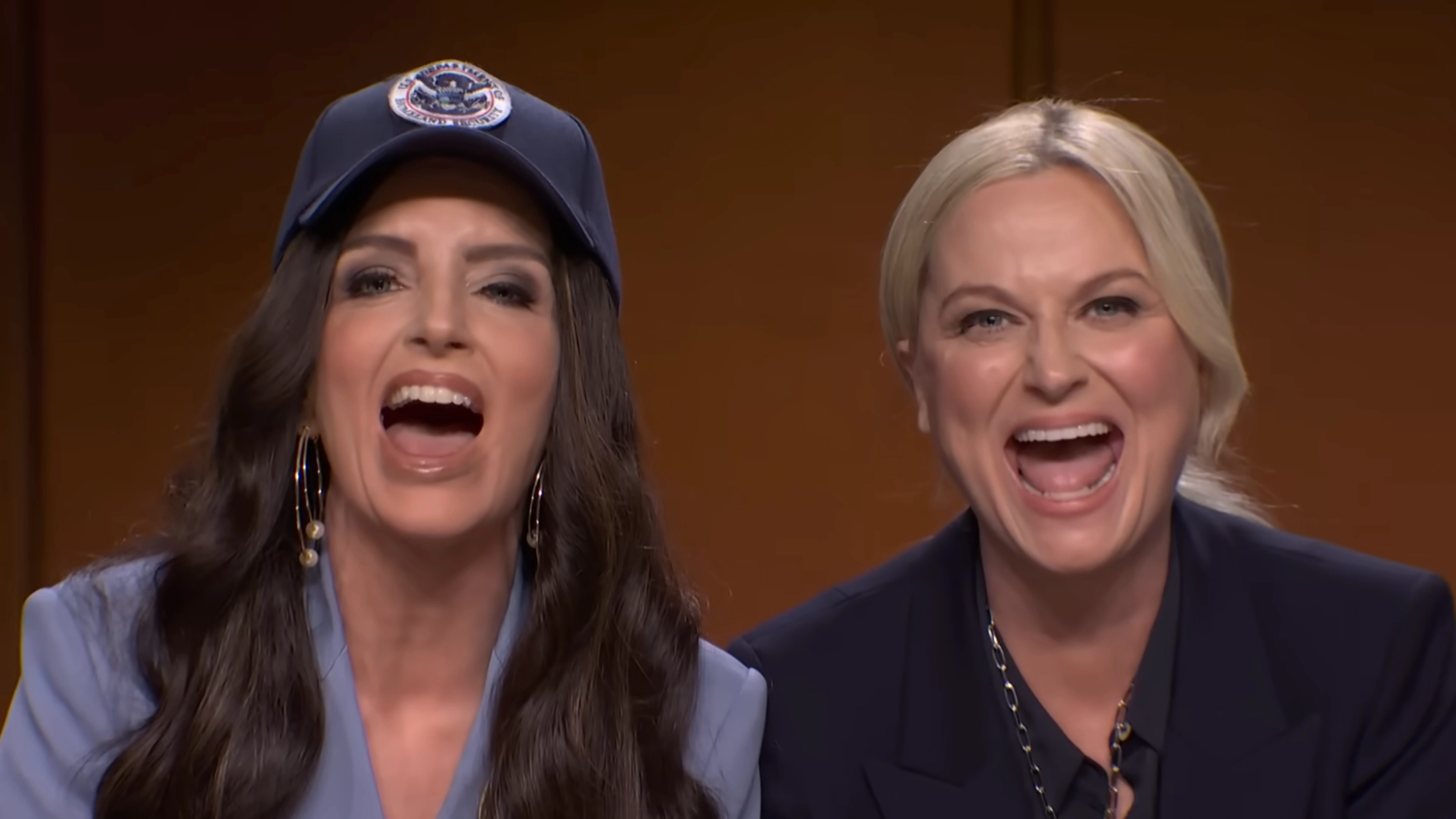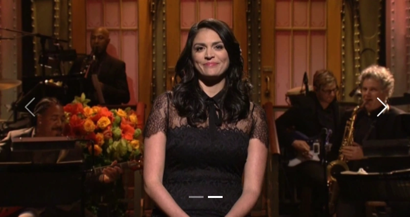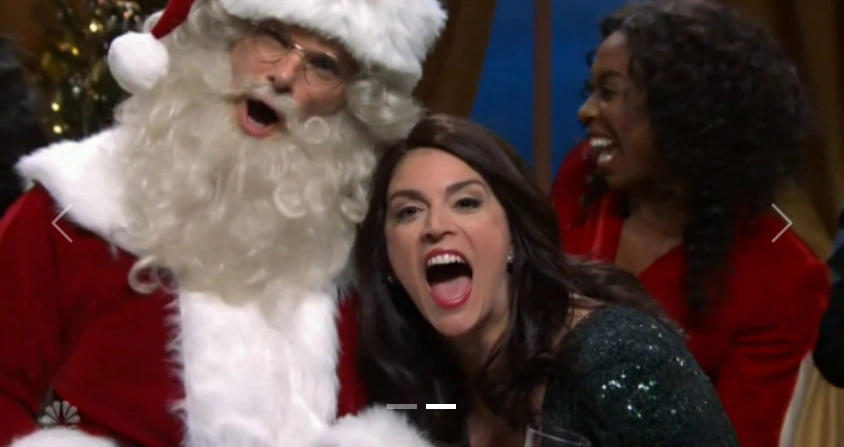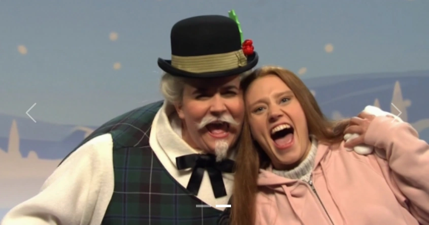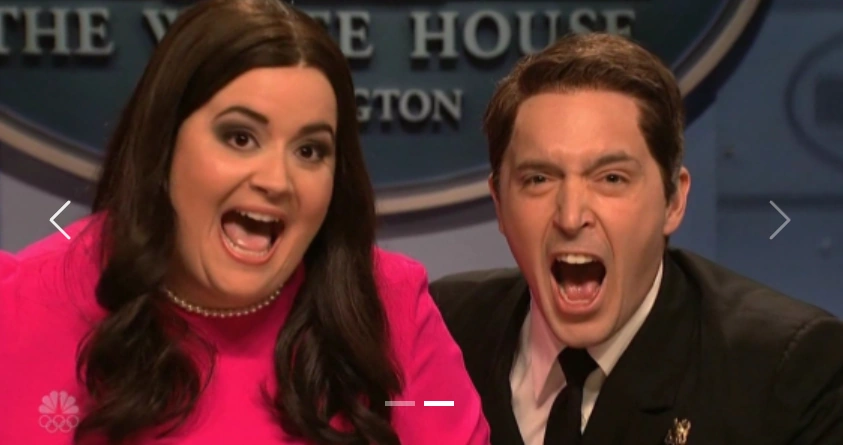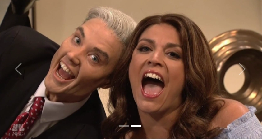 Mikey Day (says "Live from New York...") and Cecily Strong (says "It's Saturday Night")