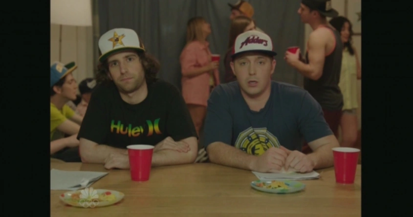 Two boys (Beck Bennett and Kyle Mooney) host a talk show in the basement of Keith's (Jonah Hill) father's (Bobby Moynihan) house. |