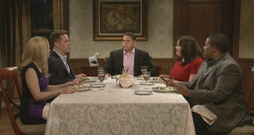A man (Jonah Hill) has dinner at the home of his boss and boss' wife (Beck Bennett and Kate McKinnon) and another couple (Kenan Thompson and Aidy Bryant). At every minor slipup, he runs to the bathroom to scream at himself, not realizing the others can hear. |