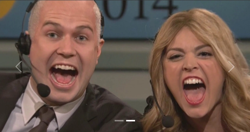 Scott Hamilton (Killam) and Tara Lipinski (Strong) are commentators of the heterosexual figure skating competition, replacing the normal figure skating team due to Russia's anti-gay laws. Included Bobby Moynihan, Jay Pharoah, Kate McKinnon, and Beck Bennett as skaters. |