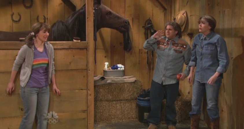 Two stable owners (Cecily Strong and Jonah Hill) are attacked by horses while a child (Nasim Pedrad) watches. |