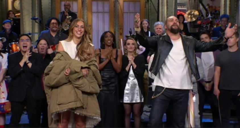 Jason Momoa thanked Tate McRae, all the cast, Lorne Michaels (and wishes him a "Happy Birthday", as well), and everyone for having him back. He especially thanked his mother for watching and everyone back in Norwalk Iowa who watched this with him, they raised him on, he was raised on the Midwest, he's so proud of this show, he's coming back and loves them all. During the goodnights, Colin Jost holds up a sign saying "We Love You, Dana and Paula". The message is to longtime former cast member Dana Carvey and his wife, who lost their 32-year-old son, Dex to an accidental overdose.