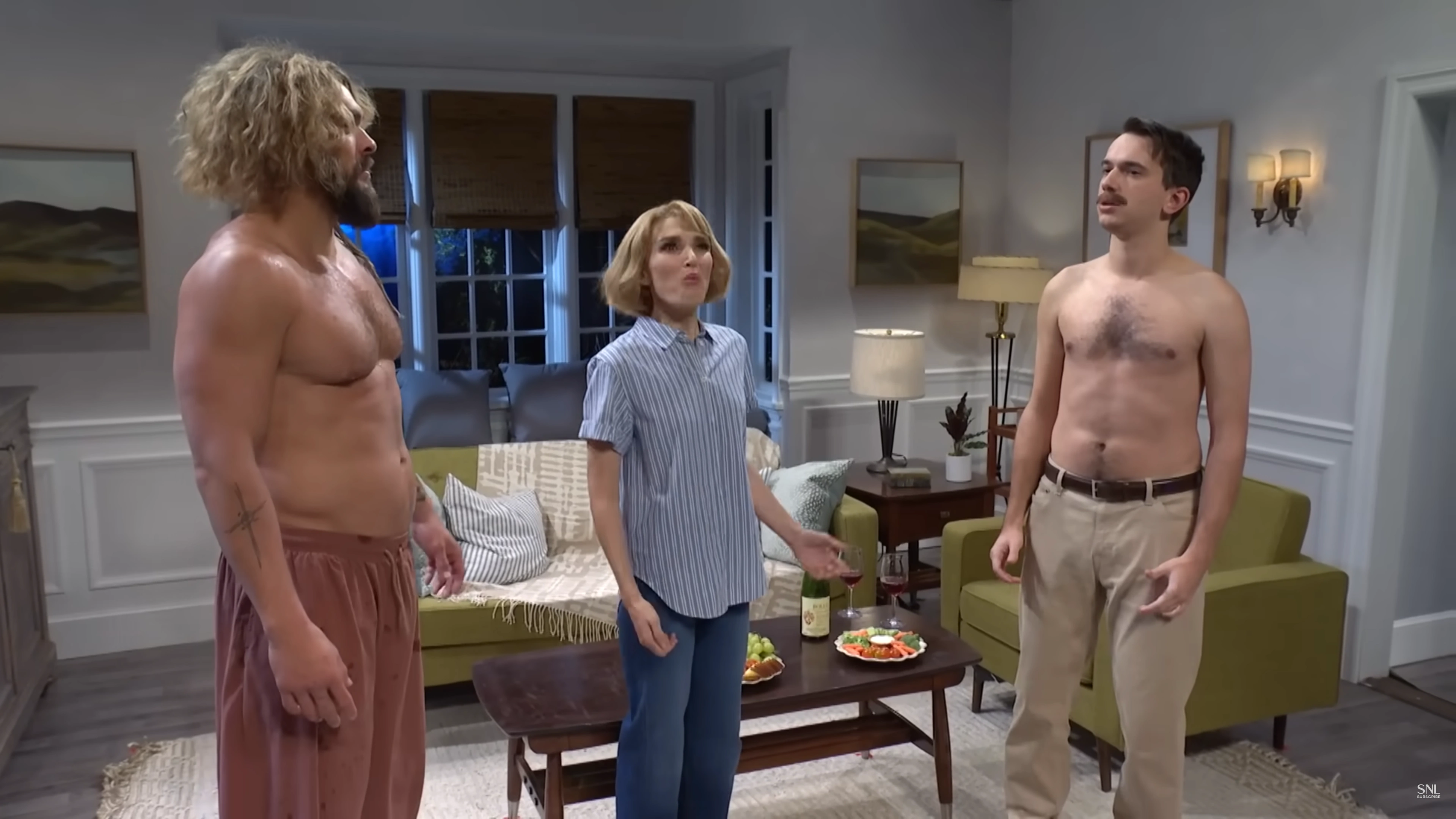 A man (Jason Momoa) finds his ex (Chloe Fineman) after much time away, after a shipwreck, much to the dismay of Fineman's character's husband (Andrew Dismukes).