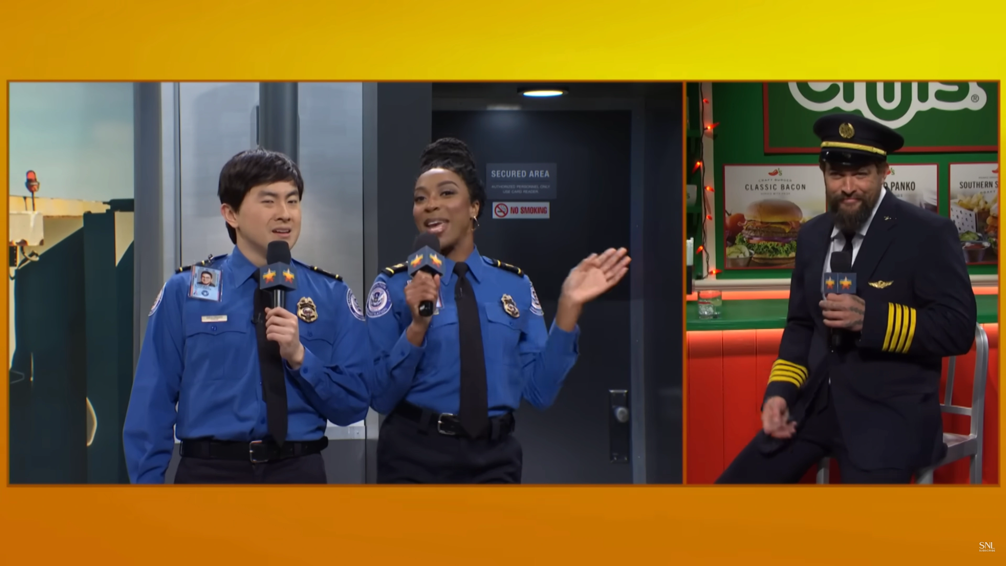 Two TSA agents (Ego Nwodim, Bowen Yang) introduce random travelers as they host the Thanksgiving Week Airport Parade. With host Jason Momoa as Captain Gary Rogers. Also Features Andrew Dismukes and Kenan Thompson as fellow TSA Agents, Chloe Fineman as a woman who has too many service animals, Michael Longfellow as a guy who enjoys getting patted down too much, Molly Kearney as a woman who took her ambien too soon, James Austin Johnson as a gentle father to his out-of-control child, Punkie Johnson as a woman who refuses to check her bag, Marcello Hernandez and other extras as part of gay group, Sarah Sherman as the Crazy Plane Lady, and Devon Walker as the guy who records her.