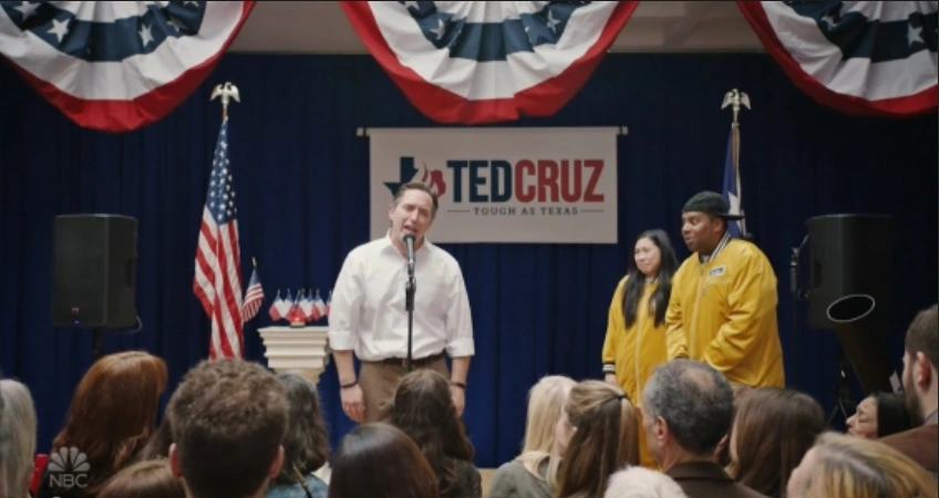 A hype man and woman (Kenan Thompson, Awkwafina) try to get the crowd at a Ted Cruz (Beck Bennett) rally excited.