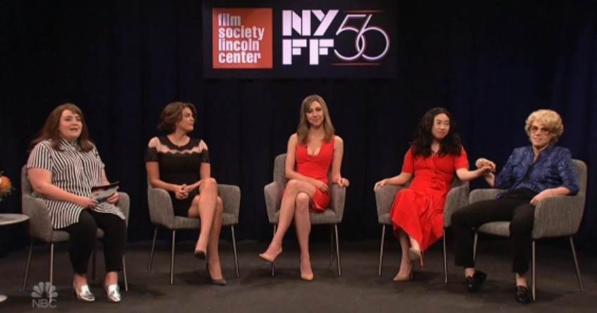 Actresses Marion Cotillard (Cecily Strong), Allison Janney (Heidi Gardner), Sandra Oh (Awkwafina) and Debette Goldry (Kate McKinnon) sit on a panel to discuss two years of the #MeToo movement. Aidy Bryant plays the host Karen Domineau.