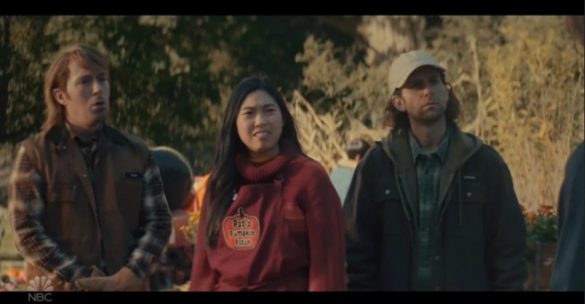 The boss of the pumpkin patch (Mikey Day) confronts his employees (Beck Bennett, Kyle Mooney and Awkwafina) about some ruined pumpkins.